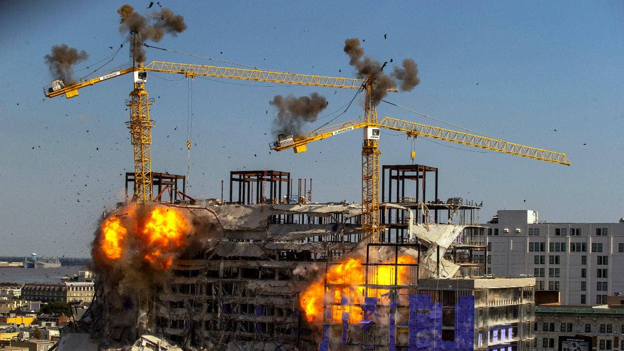 Implosion of unstable cranes at NOLA Hard Rock collapse site