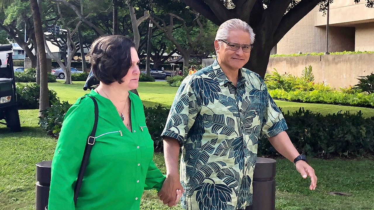 In this March 12, 2019, file photo, retired Honolulu police chief Louis Kealoha and his wife, former deputy city prosecutor Katherine Kealoha, hold hands while walking to U.S. district court in Honolulu. A once-respected, now-estranged power couple are scheduled to be sentenced Monday, Nov. 30, 2020, in Hawaii's biggest corruption case. A jury convicted Katherine and Louis Kealoha of conspiracy in a plot to frame her uncle to keep him from revealing fraud that financed their fancy lives. (AP Photo/Jennifer Sinco Kelleher, File)