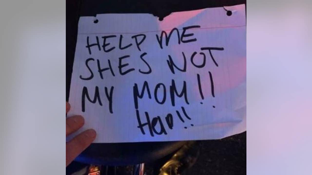 Motorists on a highway in Northern California on Saturday called police after spotting a female juvenile in the backseat of a car holding up a sign that read: “Help me she’s not my mom!! Help!!”