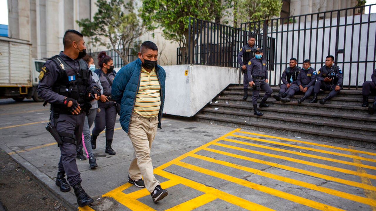 David Coronado Perez, who is allegedly part of a human trafficking network, is escorted by an officer at the end of his court hearing, in Guatemala City, Friday, Feb. 4, 2022. (AP Photo/Oliver de Ros)