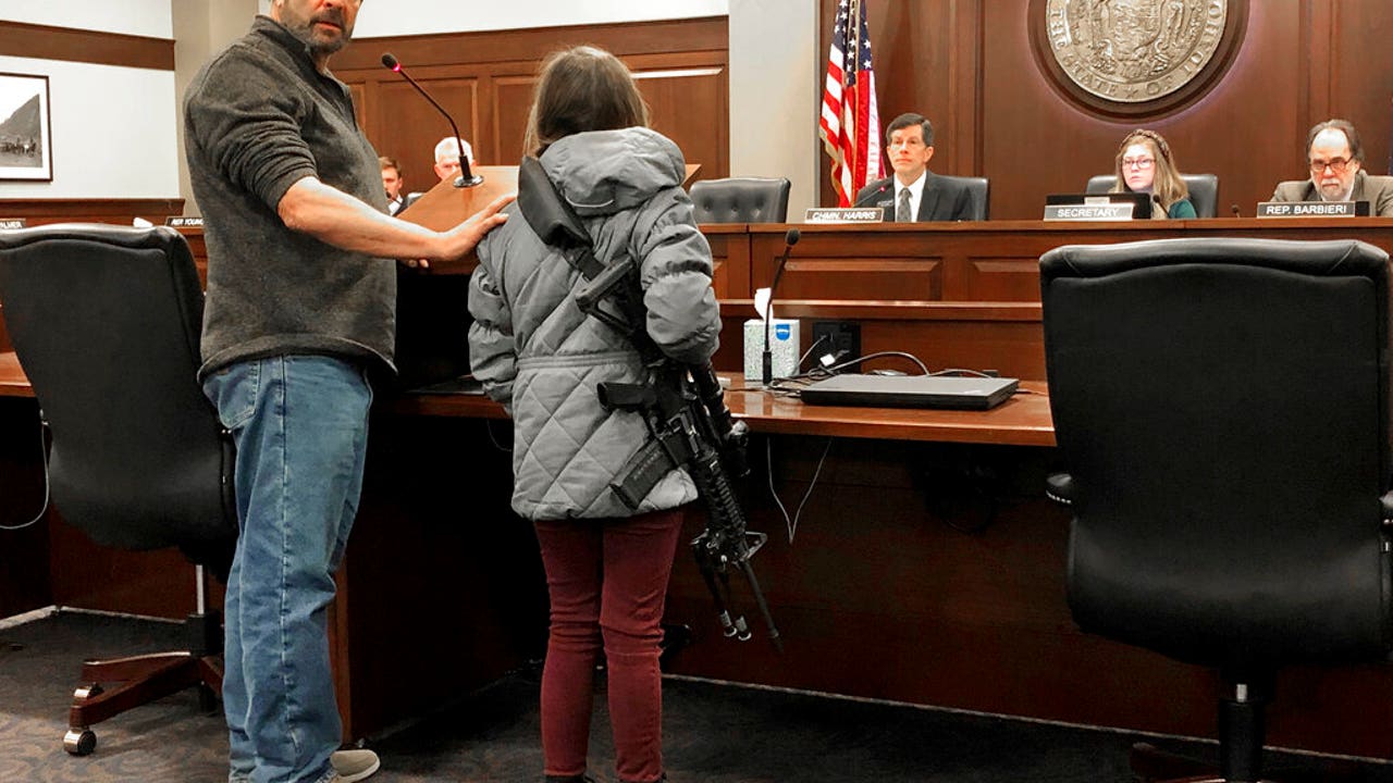 An 11-year-old girl appeared at a gun legislation hearing in Idaho’s capital Monday wearing a loaded AR-15 rifle slung over her shoulder.