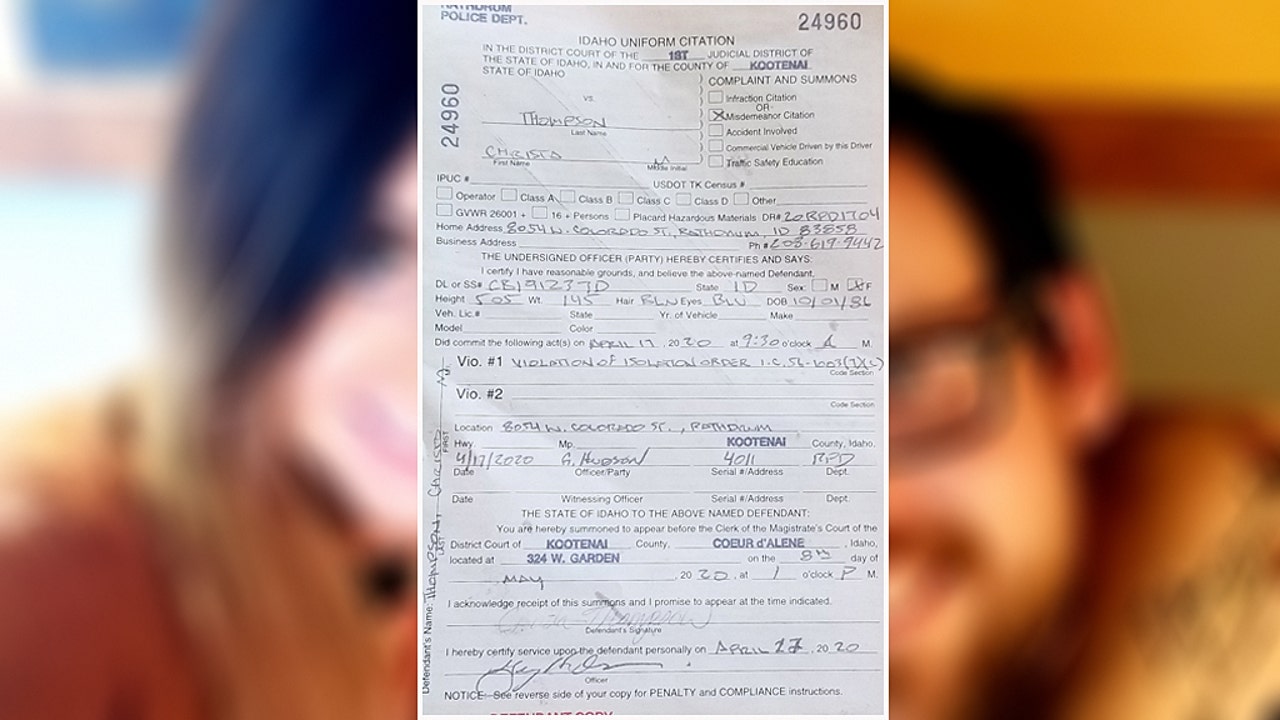 Summons issued to Christa Thompson charging her with holding a yard sale in violation of Idaho's coronavirus stay at home order. (Idaho Freedom Foundation)
