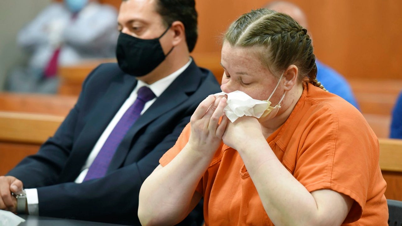JoAnn Cunningham cries and wipes her nose during her sentencing hearing Thursday, July 16, 2020, in Woodstock, Ill. Cunningham pled guilty in December to killing her five-year-old son Andrew "A.J." Freund in April 2019 in her Crystal Lake home. She was sentenced Friday to 35 years in prison. (John Starks/Daily Herald via AP, Pool)
