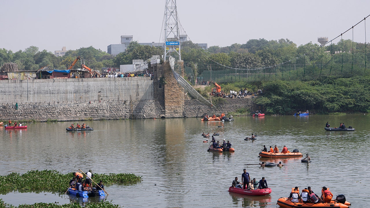 Rescuers on boats search in the Machchu river next to a pedestrian bridge that collapsed in Morbi, a town in the western state of Gujarat, India, on Monday. (AP Photo/Ajit Solanki)