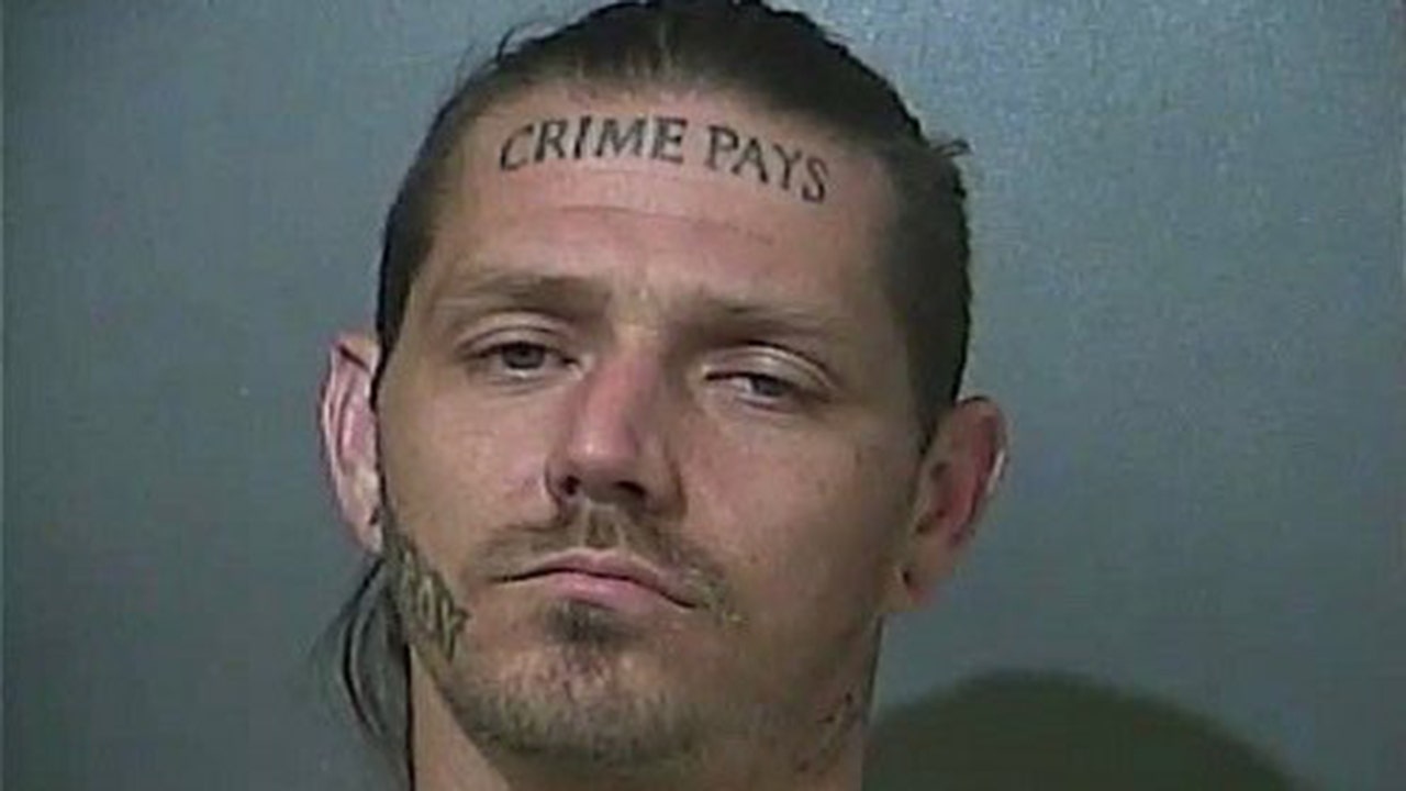 A man with a tattoo on his forehead that says “Crime Pays” has run afoul of police in Indiana for the second time since Nov. 29.