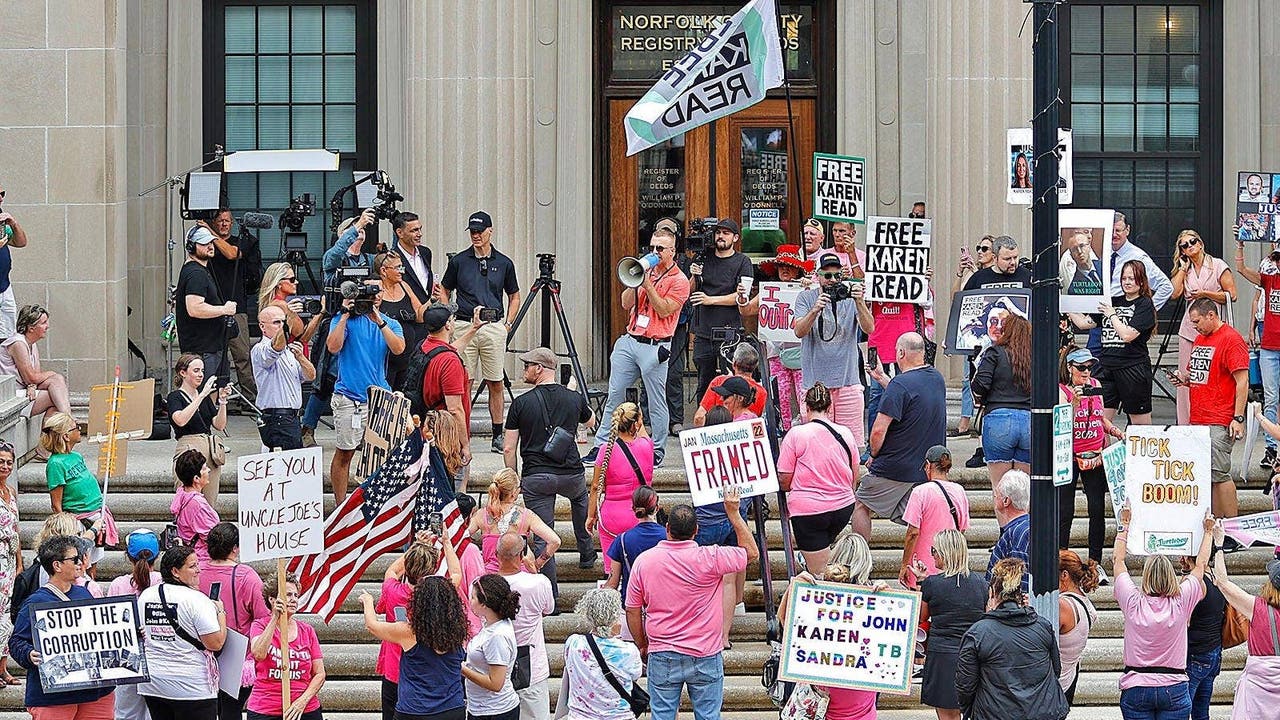 Critics of Karen Read gather outside the courthouse in Dedham, MA on Friday, June 28, 2024. Read is facing three charges, including second-degree murder of her Boston police officer boyfriend John O’Keefe in January 2022. (Patriot Pics/Backgrid for Fox News Digital)