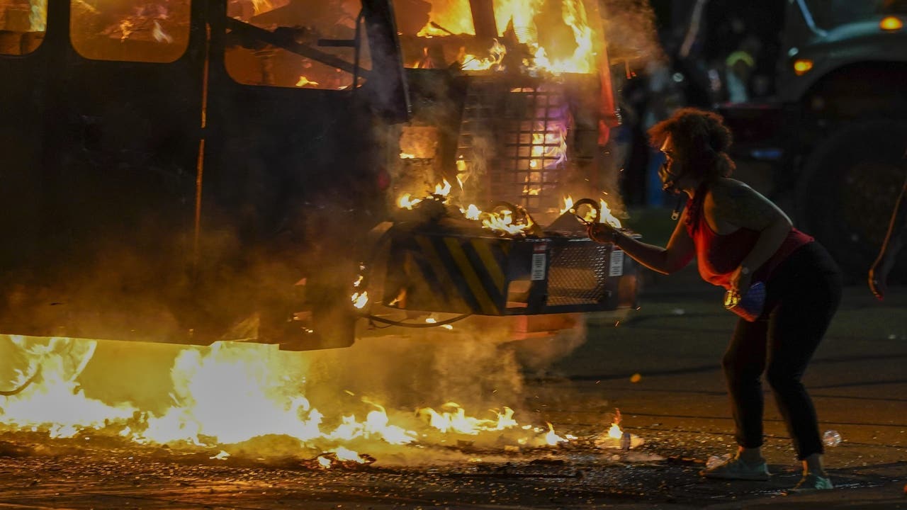 In a third video, a person wearing face and head coverings appears to spray a liquid at an already flaming truck that was parked at Car Source, a dealership that was devastated by the fires set during riots, on Aug. 24, officials said.