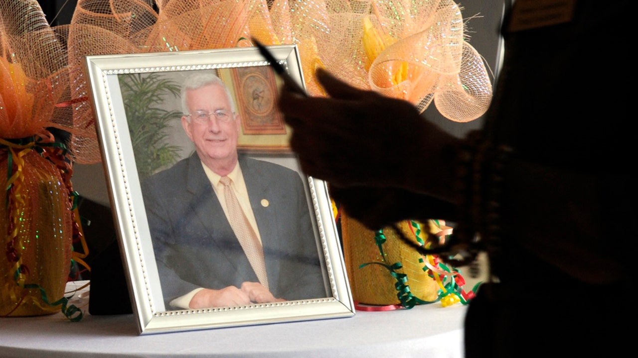 Don Driver, the younger brother of the late Mayor Billy Joe Driver, holds a photo of the longtime public official after a memorial service in Clanton, Ala., on Friday, Aug. 28, 2020. (AP Photo/Jay Reeves)