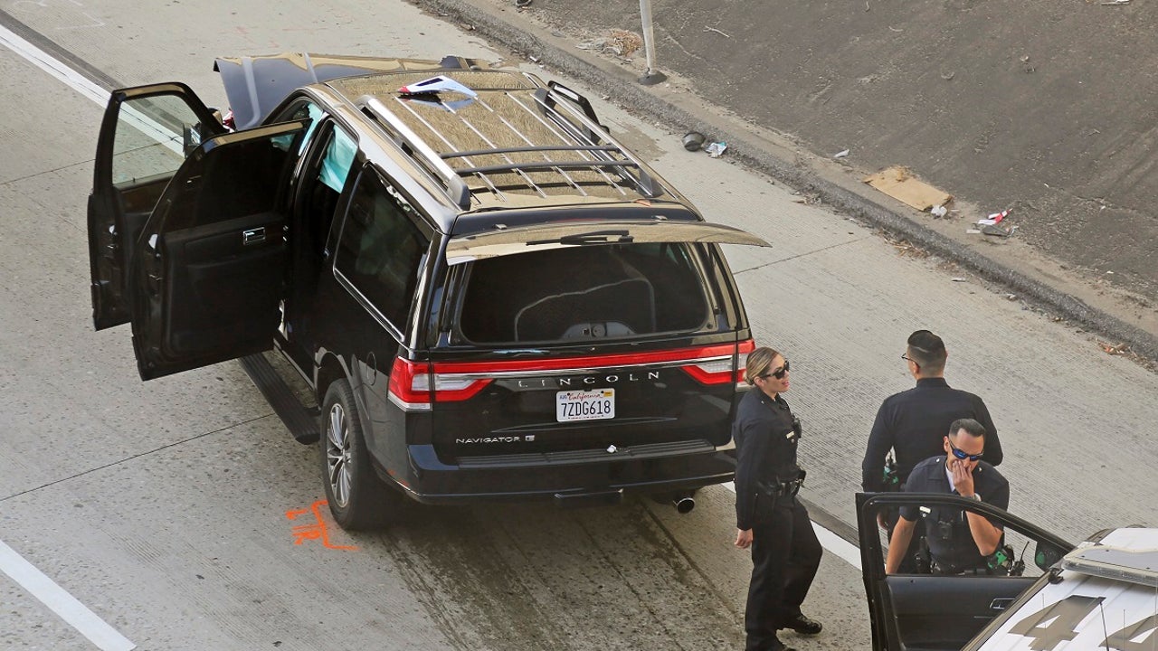 Los Angeles police officers stand after a pursuit of a stolen hearse with a casket and body inside on Interstate 110 in South Los Angeles last week. The hearse was stolen from outside a Greek Orthodox church in East Pasadena on Wednesday night. (AP Photo/Reed Saxon)