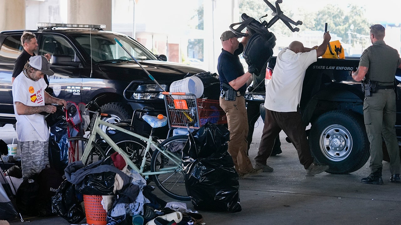 Louisiana Wildlife and Fisheries agents assist state police as they give instructions to people living in a homeless encampment to move to a different pre-designated location as they perform a sweep in advance of a Taylor Swift concert in New Orleans on Wednesday. (AP Photo/Gerald Herbert)