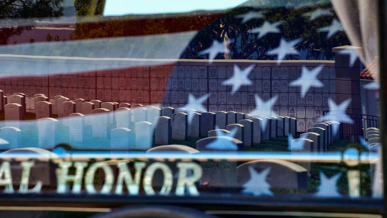 A military honor guard drapes a U.S. flag over the casket of Marine Corps, Pfc. John Franklin Middleswart for a full military honors at Fort Rosecrans National Cemetery, Tuesday, June 8, 2021 in San Diego. Eighty years after he died in the attack on Pearl Harbor and just months after his remains were finally identified, the California Marine has been laid to rest with full military honors. About 50 people attended the ceremony Tuesday for Middleswart in his hometown of San Diego, the Union-Tribune reported. (Nelvin C. Cepeda/The San Diego Union-Tribune via AP)