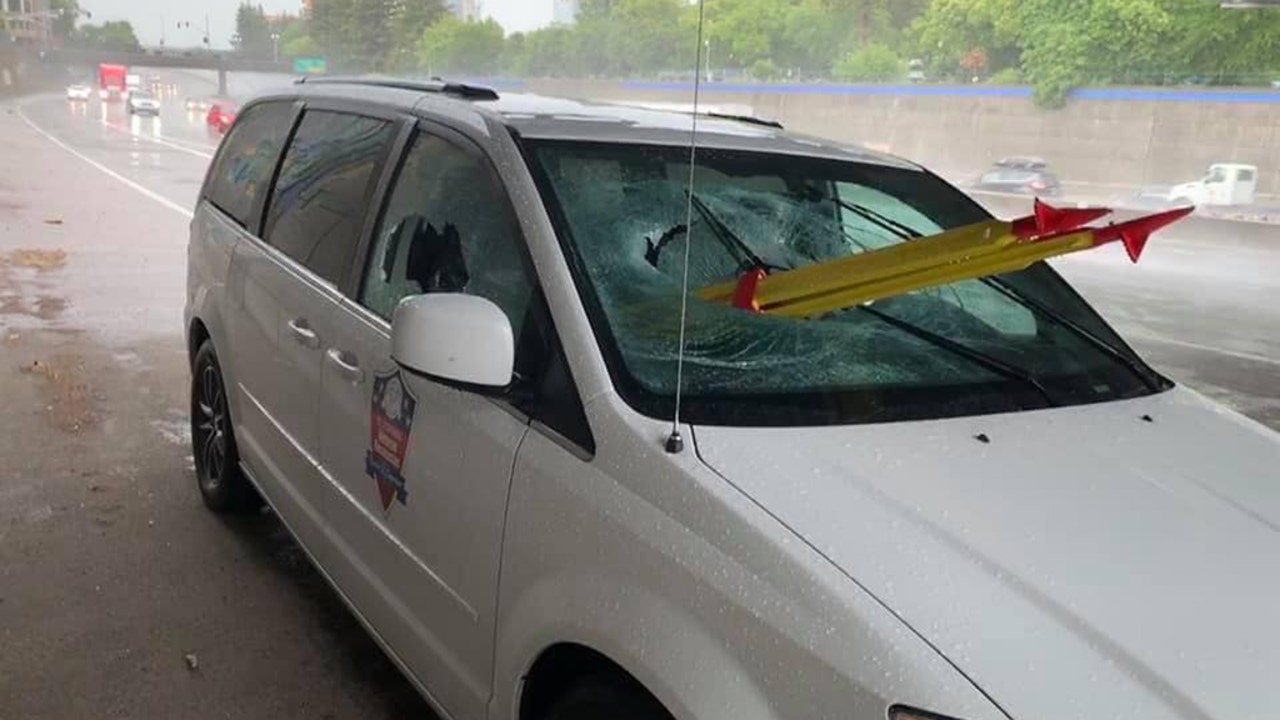 The driver of the van told KCRA-TV that he was on I-5 when he saw “a yellow something” out of the corner of his eye.