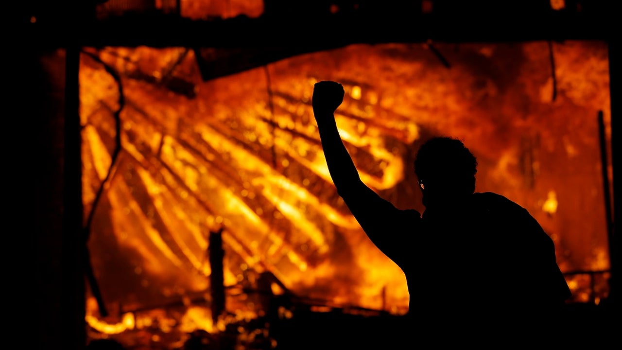 A protester gestures in front of the burning 3rd Precinct building of the Minneapolis Police Department on May 28, in Minneapolis. A suspect has been charged in connection with the suspected arson. (AP Photo/Julio Cortez)