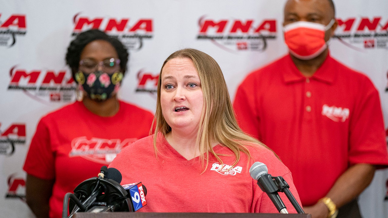 Angela Becchetti, a registered nurse from Abbott Northwestern- Alina, speaks at a press conference announcing the intent for the nurses to strike Thursday, Dec. 1, 2022 at the Minnesota Nurses Association in St. Paul, Minn. (Alex Kormann/Star Tribune via AP)