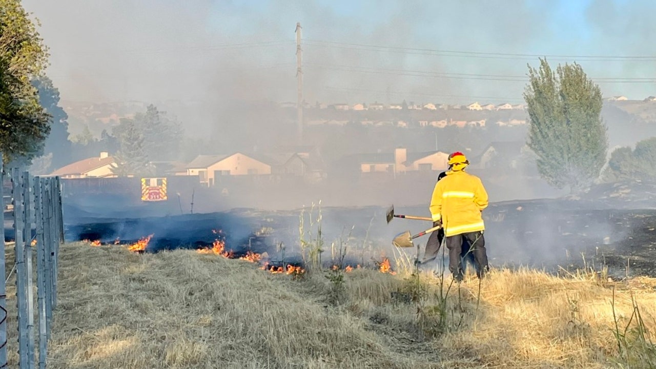Photos show smoke stretched across a field of burned vegetation and dry grass on the edge of a residential neighborhood, as well as several flares recovered from the stolen car, which police found double-parked in an area for electric vehicle charging.
