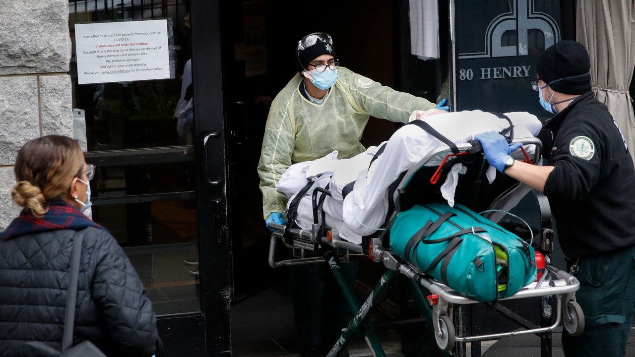 A patient is wheeled into Cobble Hill Health Center by emergency medical workers in the Brooklyn borough of New York on April 17, 2020. A letter from the Centers for Medicare and Medicaid Services and the Centers for Disease Control and Prevention reports more than 60,000 cases of coronavirus illness among nursing home residents. (AP Photo/John Minchillo, File)