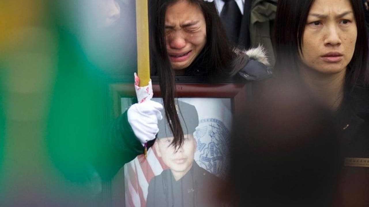 Widow Pei Xia Chen reacts while clutching a photo of slain New York Police Department officer Wenjian Liu as his casket departs his funeral in the Brooklyn borough of New York January 4, 2015. (REUTERS/Carlo Allegri)