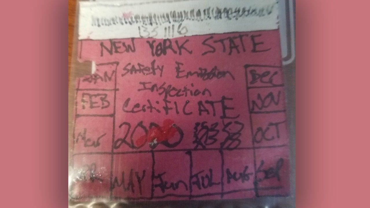 The "inspection sticker" appears to be a red piece of construction paper with almost illegible handwriting implying the vehicle passed inspection until January 2020.