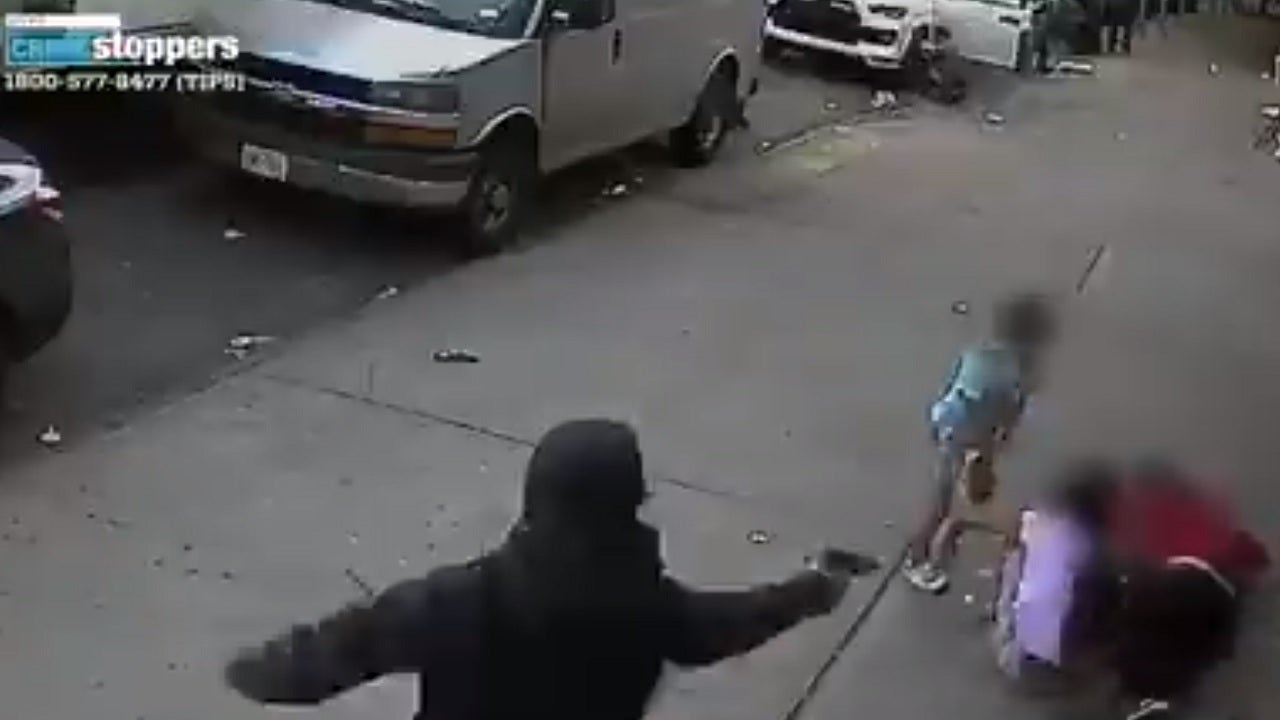 The 24-year-old man was standing on the sidewalk on Sheridan Avenue near East 172nd Street in the Bronx at about 6:44 p.m. Thursday when a gunman approached and began shooting at him, the New York Police Department (NYPD) said. But two children, ages 10 and 5, became entangled with the victim as he tried to escape his attacker, startling police video shows.