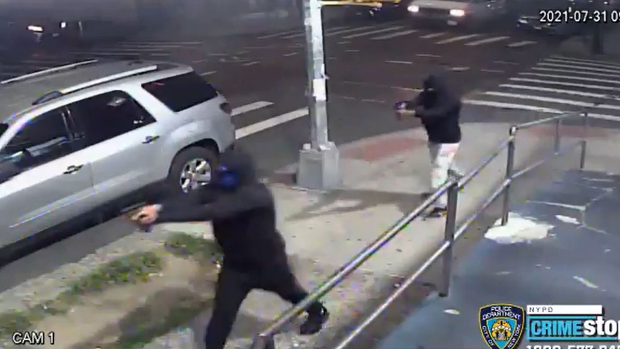 New York City police released video that shows a gunfight erupting in front of a Manhattan grocery store Saturday night that left three innocent bystanders wounded.