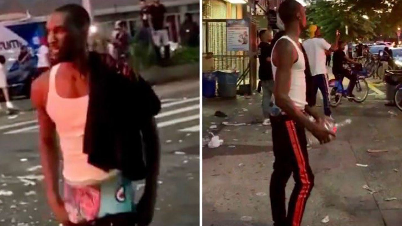 The suspect, seen wearing a white tank top and black pants with red stripes down the side, is wanted for criminal mischief, police said. The man was among several individuals who police said hurled glass bottles and debris at officers during predawn chaos in the Harlem neighborhood of Manhattan.
