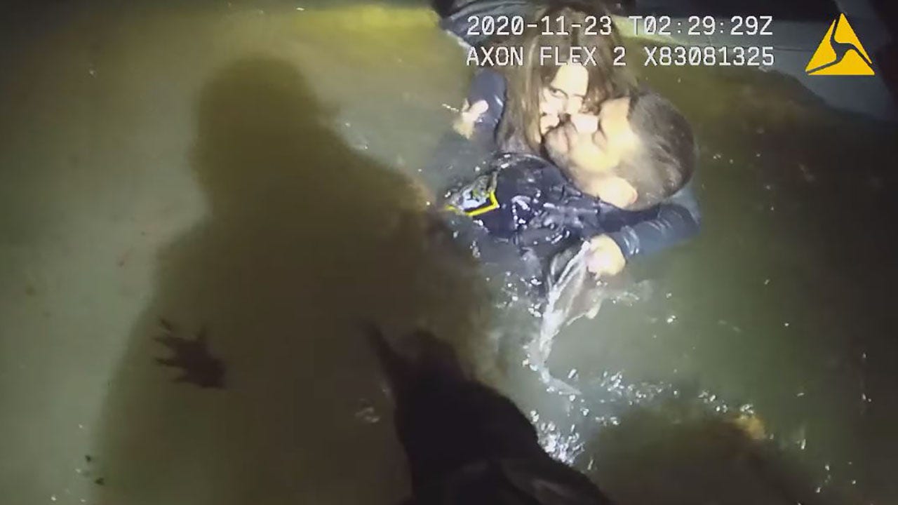 An officer in the river struggled in the cold water before breaking the rear window with a tomahawk and pulling the woman to the river bank. No one else was in the minivan.