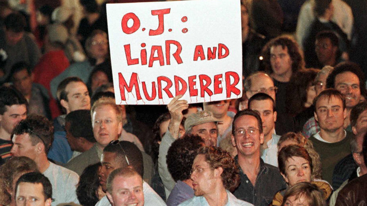 SANTA MONICA, UNITED STATES: Spectators outside the Santa Monica, California, courthouse, hold an-anti O.J Simpson placard as they react to the guilty verdicts in the Simpson wrongful death civil trial 04 February. Simpson was found liable for the deaths of his ex-wife Nicole Brown Simpson and her friend Ron Goldman. (Photo credit should read HECTOR MATA/AFP via Getty Images)