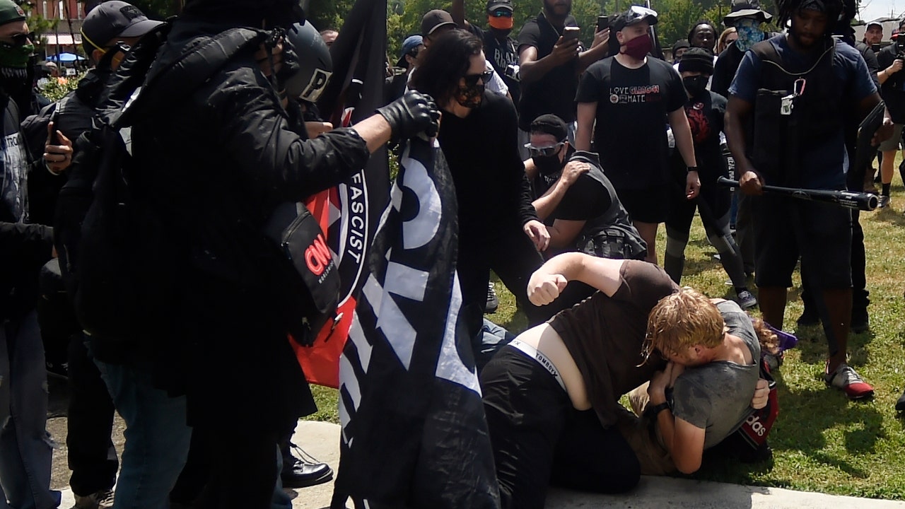 A man falls after being hit by counter demonstrators during a protest Aug. 15, in Stone Mountain Village, Ga. (AP Photo/John Bazemore)