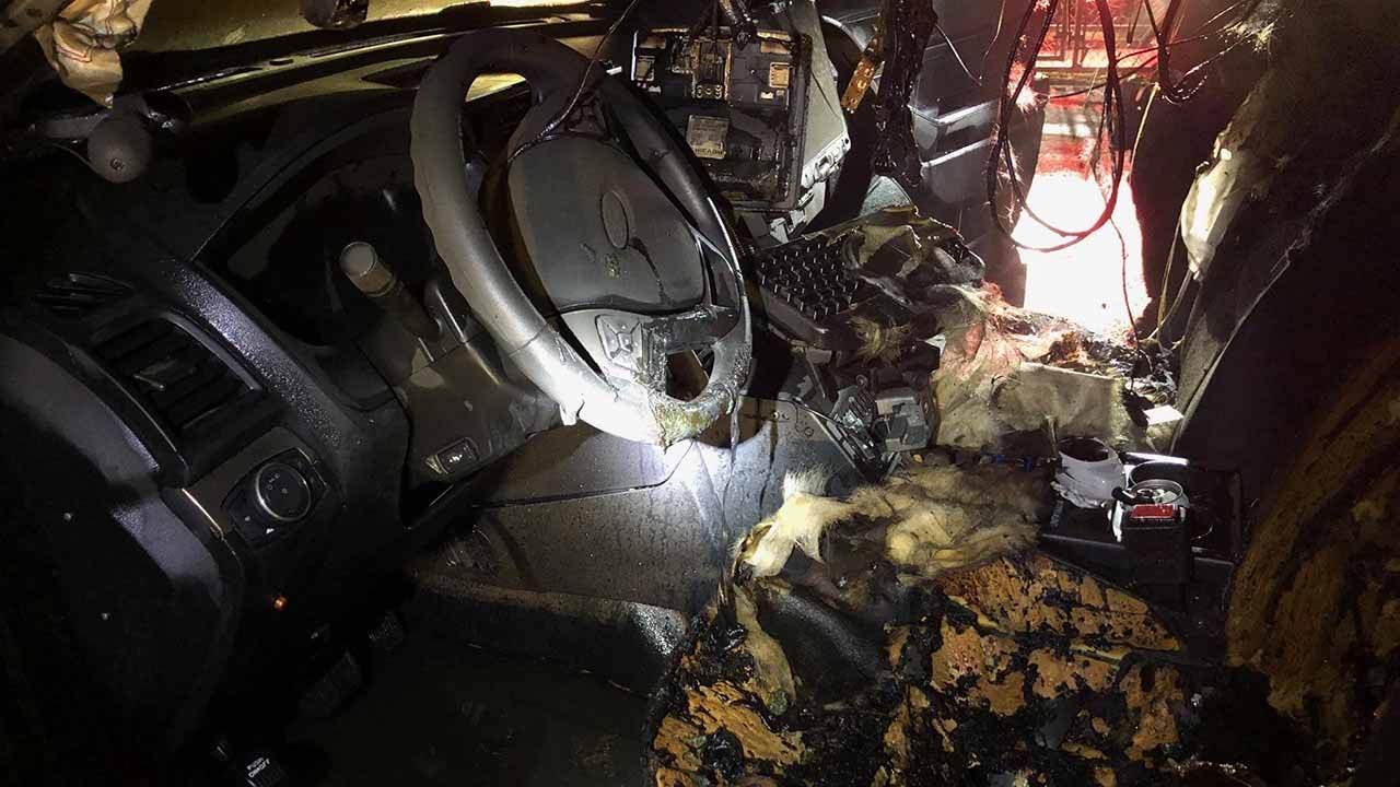 The Portland Police Bureau released photos showing the heavily damaged interior of the vehicle. The cause of the fire is under investigation, but police said arson is suspected.