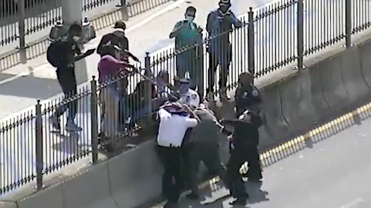 The video shows someone from the group along the bridge approaching the edge of the fence, leaning over and whacking the officers huddled against the barrier.