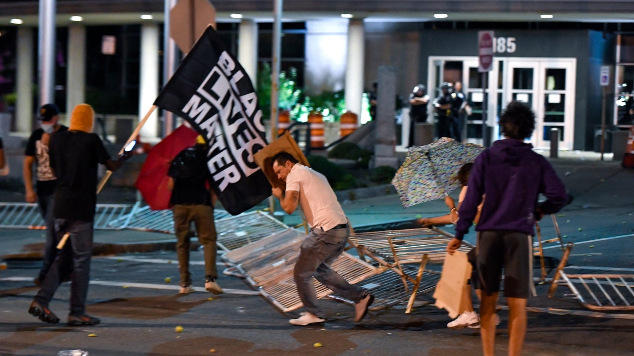 Protesters tear down the barricades in front of the Public Safety Building in Rochester, N.Y., Thursday, Sept. 3, 2020. Seven police officers involved in the suffocation death of Daniel Prude in Rochester were suspended Thursday by the city's mayor, who said she was misled for months about the circumstances of the fatal encounter. (AP Photo/Adrian Kraus)