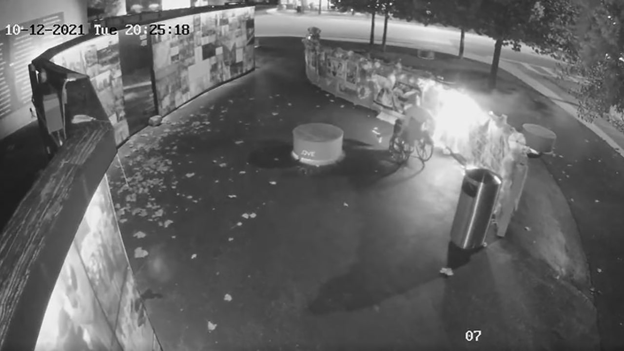 An unidentified individual in a wheelchair was seen on video setting fire to a memorial in Orlando that honored the victims of the 2016 Pulse Nightclub mass shooting. (onePulse Foundation)
