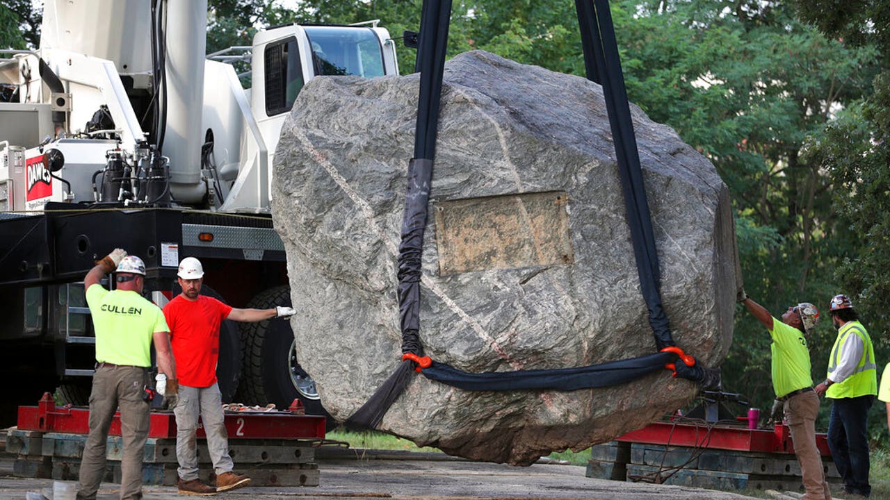Crews work to remove Chamberlin Rock from Observatory Hill on UW-Madison campus in Madison, Wis., Friday, Aug. 6, 2021. The University of Wisconsin is removing the 70-ton boulder from its Madison campus at the request of minority students who view the rock as a symbol of racism. Chamberlin Rock, on the top of Observatory Hill, is named after Thomas Crowder Chamberlin, a geologist and former university president. (Kayla Wolf/Wisconsin State Journal via AP)