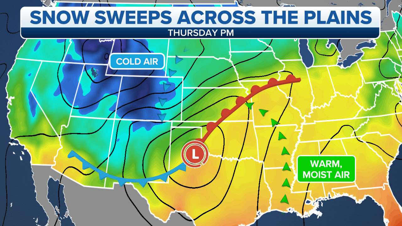 The next storm system developing across the Rockies – bringing accumulating snow – will be the nation's next weather-maker in the Plains.