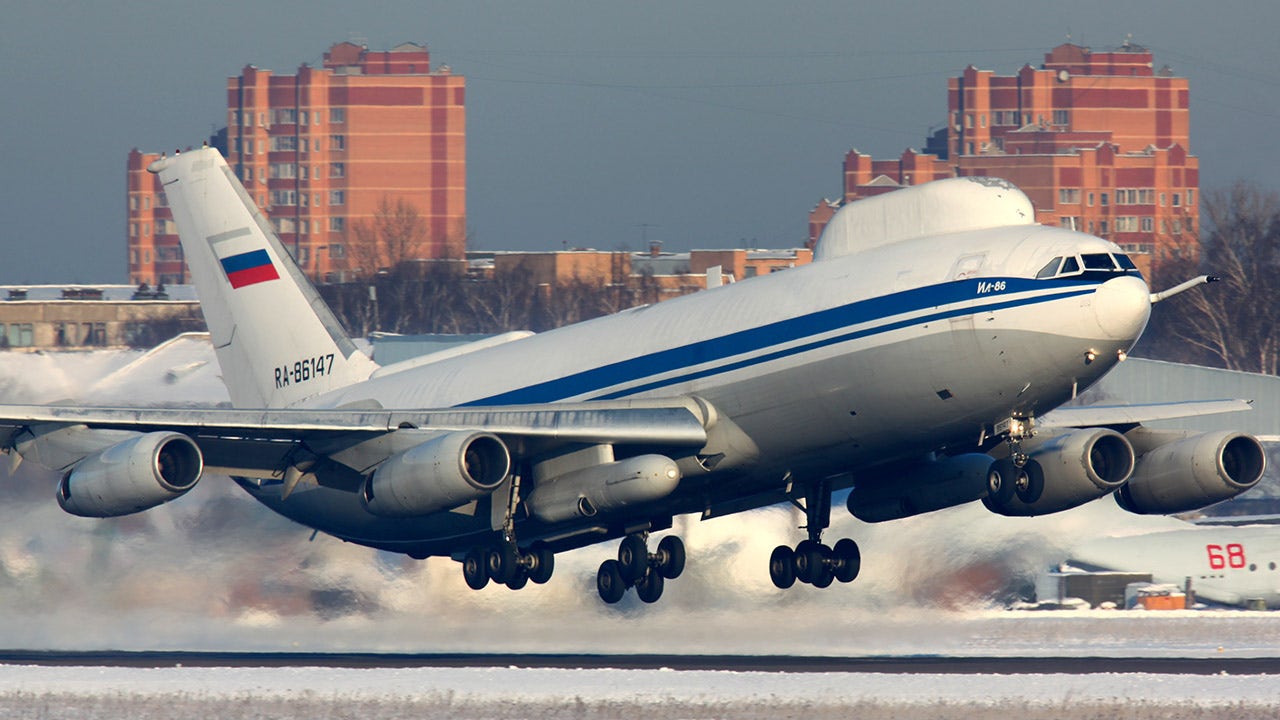 The aircraft are meant to ferry Russia’s top leadership to safety in the event of an attack and allow them to remain in touch with the armed forces. The planes are accompanied by fighter jets and are windowless save for the cockpit.