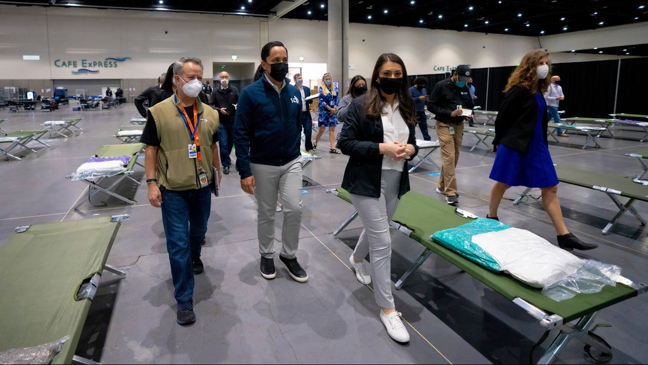 San Diego Mayor Todd Gloria along with other officials are among the group of elected officials who were given a tour of the temporary youth shelter at the center, Saturday, March 27, 2021 in San Diego. The girls will be separated in sleeping areas that will host up to 50-girls per pod. The temporary shelter will max out about 1450 girls. (Nelvin C. Cepeda/The San Diego Union-Tribune via AP)