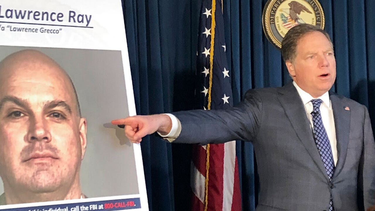 U.S. Attorney Geoffrey Berman points to a photo showing Lawrence Ray during a news conference, Tuesday, Feb. 11, 2020, in New York. Ray, an ex-convict known for his role in a scandal involving former New York police commissioner Bernard Kerik, was charged Tuesday with federal extortion and sex trafficking charges involving a group of students at Sarah Lawrence College. (AP)