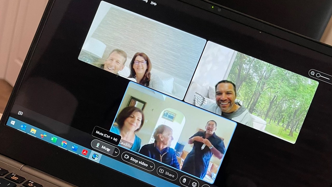 Scott Peterson pictured top right in a conference call from prison, speaking with family members. Relatives shown include his brother Joe Peterson and sister-in-law Janey on the upper left, his sister Susan and her husband Ed Caudillo, and Lee Peterson, his father, in the bottom middle. Caudillo is modeling navy blue coveralls they had just purchased for Lee, in a virtual call from May 22, 2022. (Janey Peterson)
