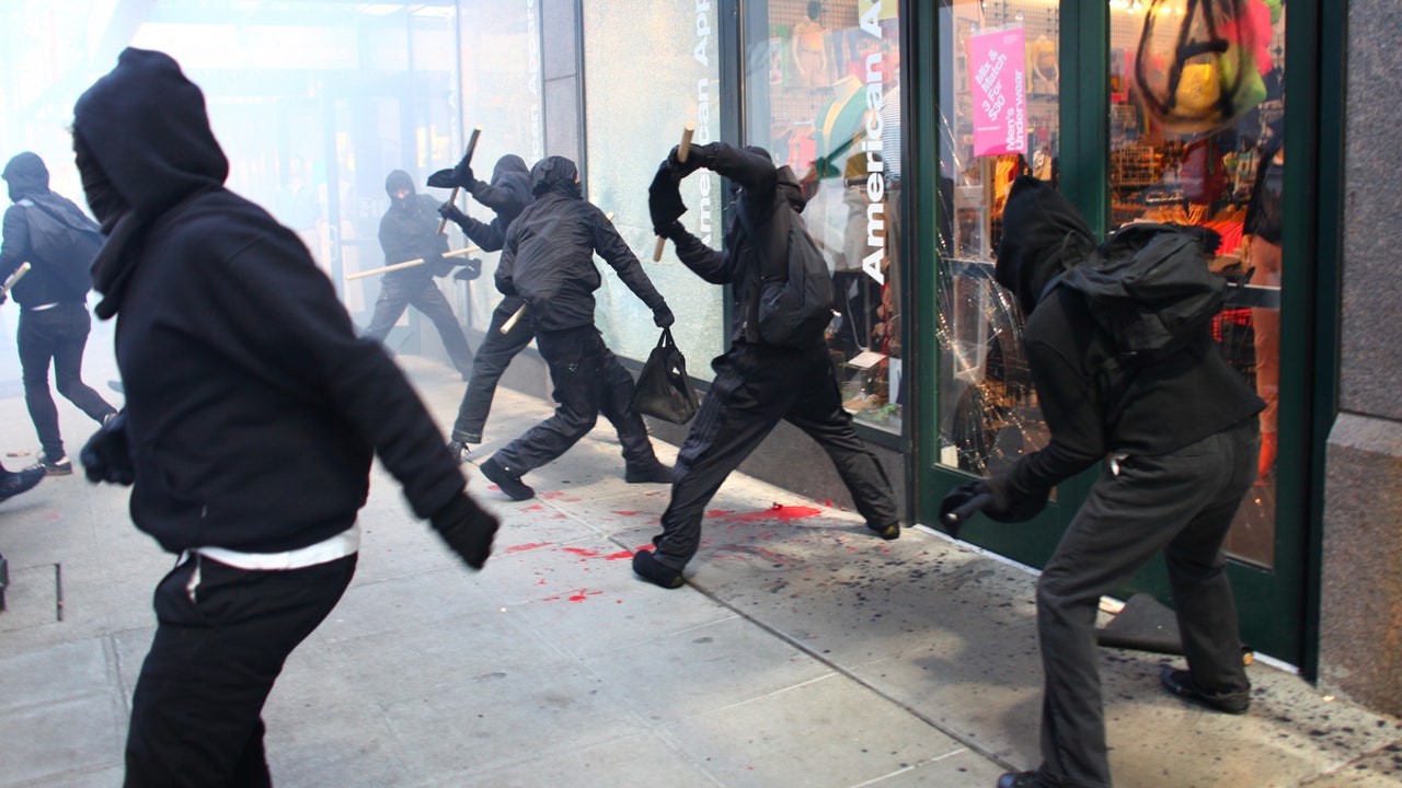 Protestors dressed in black clothing smashed windows of retail stores and banks, and spray-painted parked cars, reported Q13 FOX News. NikeTown, American Apparel, HSBC, and Wells Fargo were among the businesses protesters vandalized.