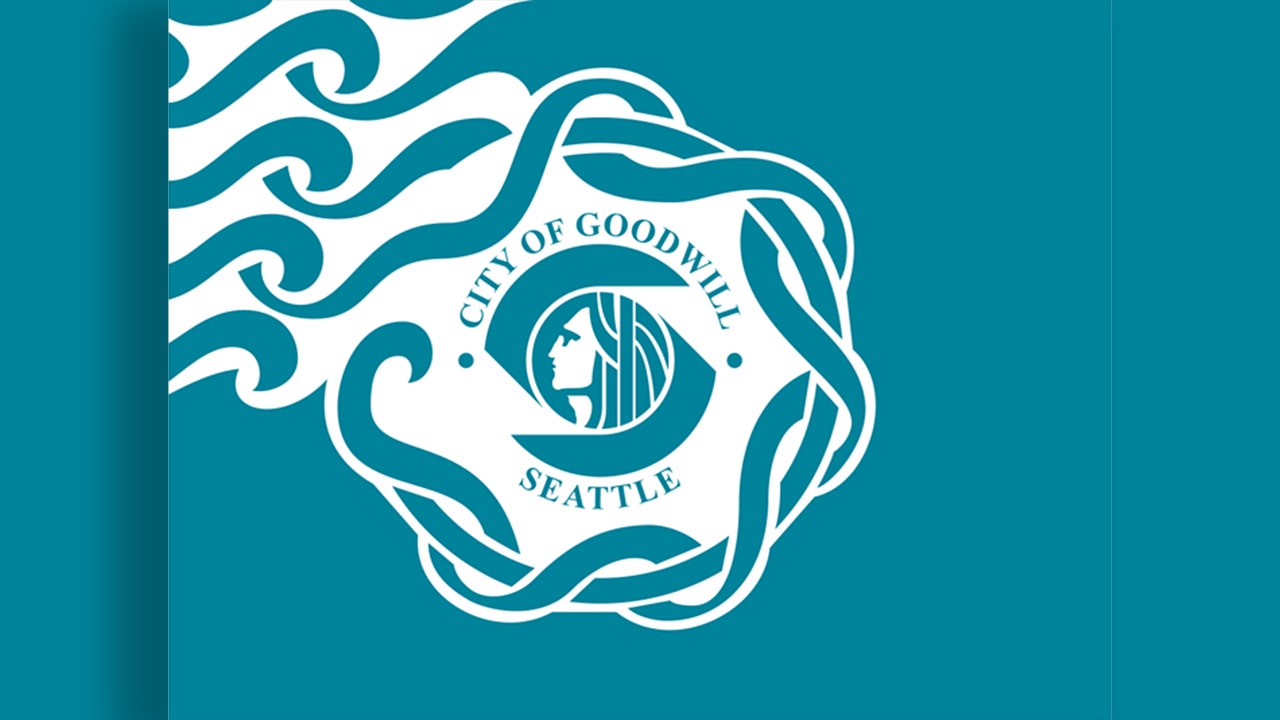 Seattle's official municipal flag is teal and white, featuring a portrait of Chief Seattle. The words "City of Goodwill" sit above the portrait, with "Seattle" below.
