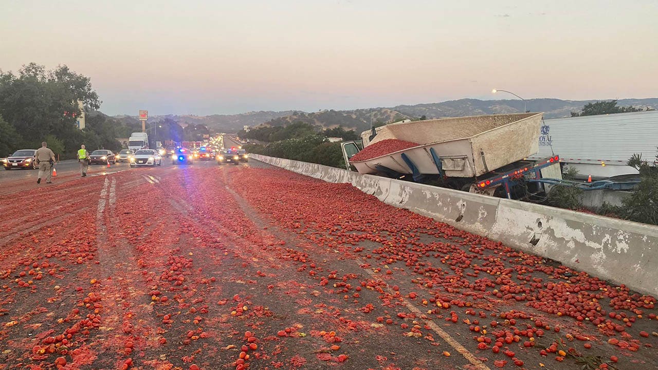 A semi-truck hauling a load of tomatoes crashed on Interstate 80 in California on Monday, spilling the fruit onto the roadway and forcing several lanes to temporarily close.