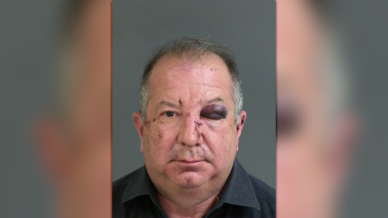 A booking photo appears to show some of the damage the intervening woman did – he’s got a black eye, cuts and bruises across his face.