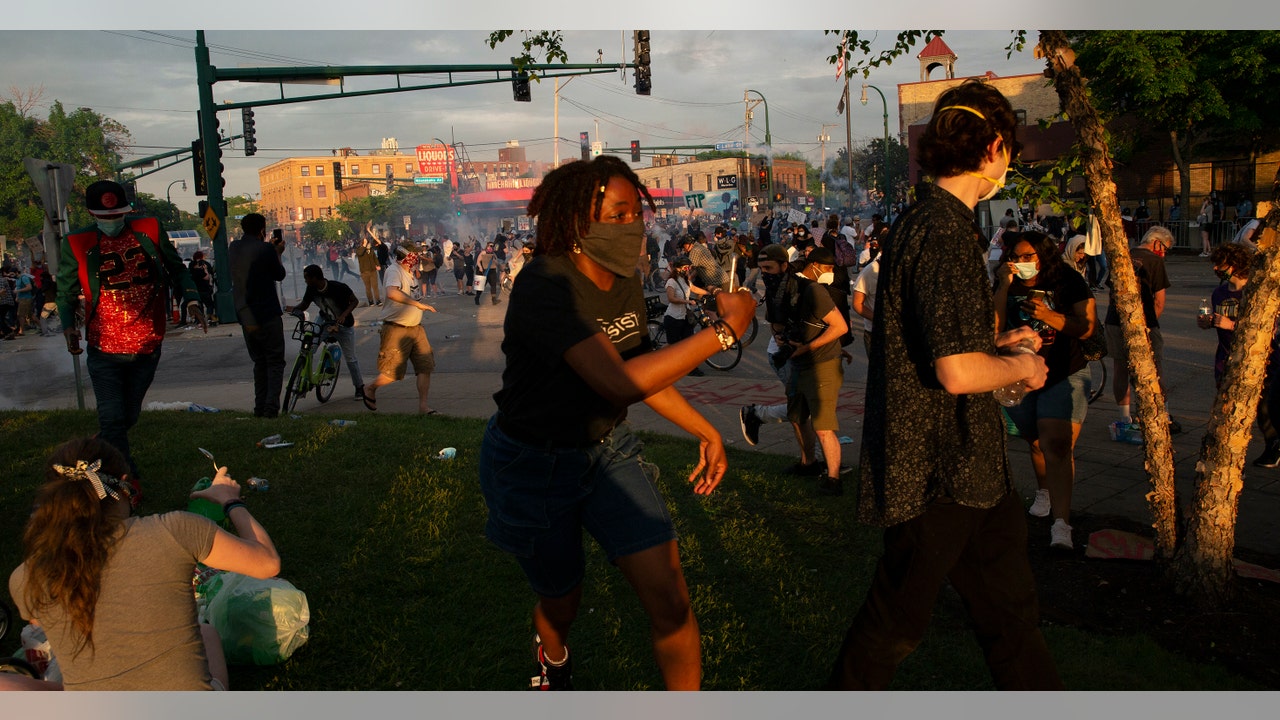 Sarah Danik, a reporter for the local Fox 9 TV station, shared images that she said were taken at the scene beginning around 3 p.m. They show crowds of masked protesters and police officers, and crashing or banging noises can be heard in some of the videos. In one image, a cloud of smoke, which she identified as tear gas, is seen rising from the sidewalk.