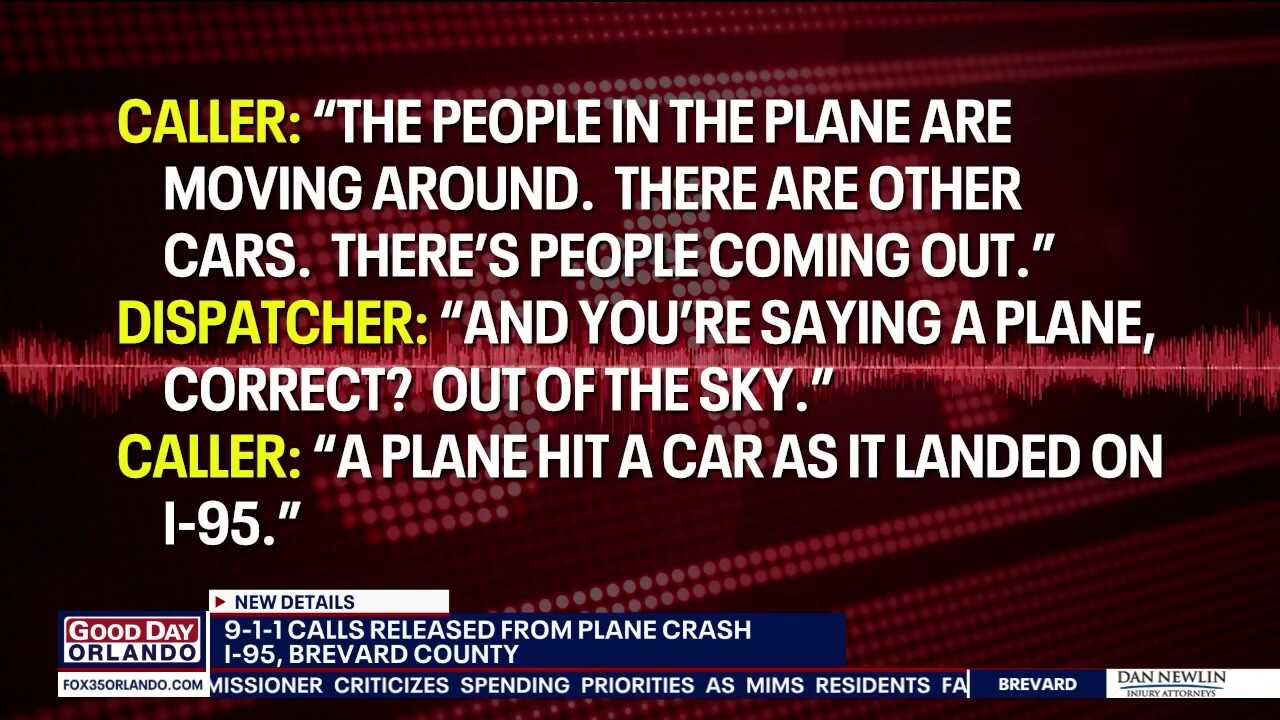 Stunning 911 audio has been released after shocked witnesses watched a plane crash into a small car while making an emergency landing on a Florida freeway.
