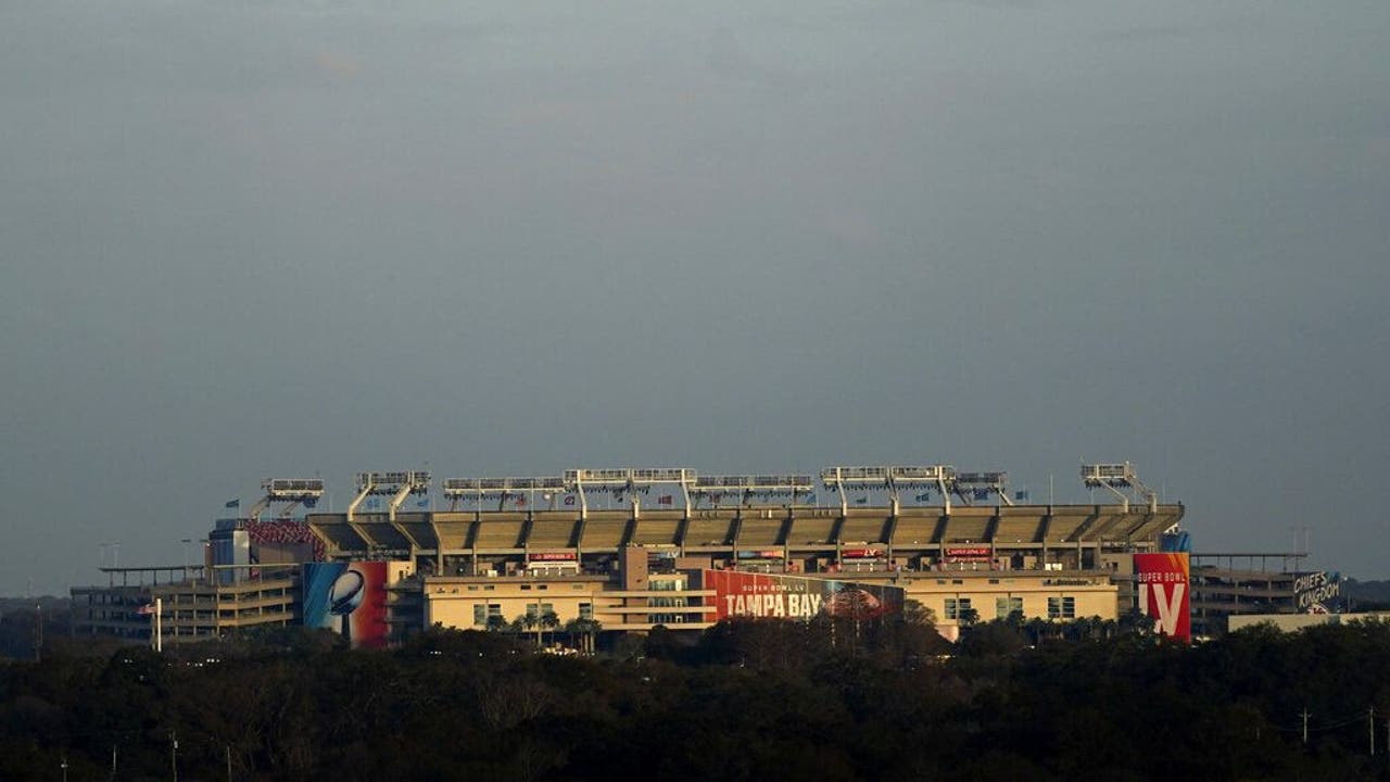 Raymond James Stadium rises in the distance ahead of Super Bowl 55 Saturday, Feb. 6, 2021, in Tampa, Fla. The venue is hosting Sunday's Super Bowl football game between the Tampa Bay Buccaneers and the Kansas City Chiefs. (AP Photo/Charlie Riedel)