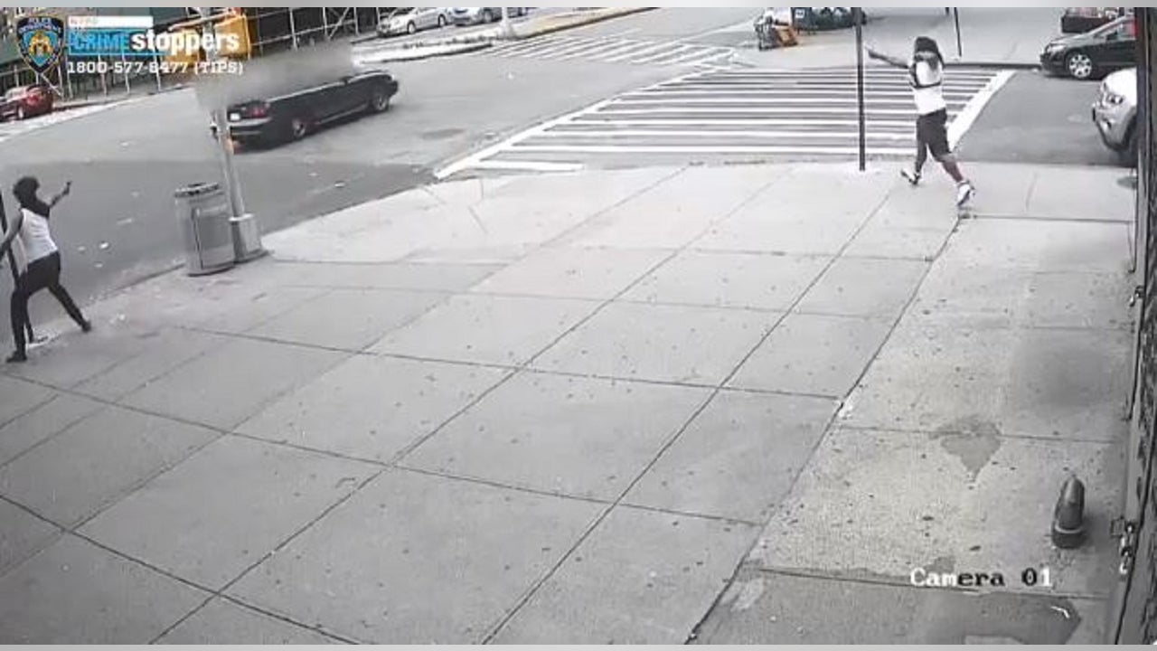 Video surveillance footage released by the New York Police Department recorded two men opening fire near 142nd Street and Lenox Avenue on a Ford Mustang, which was speeding down the street at about 7:10 a.m. Sunday.
