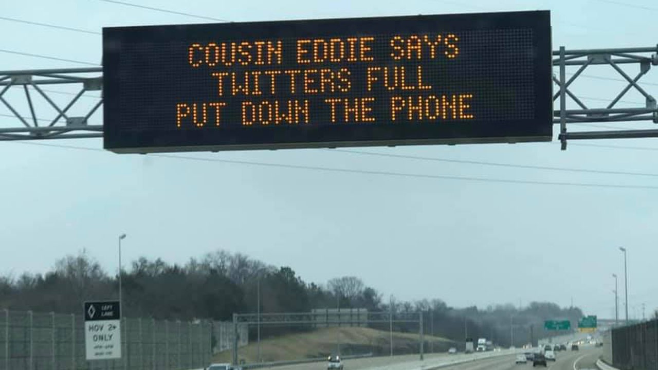 Tennessee Highway Patrol posted a photo to Facebook over the weekend, featuring a creative overhead signboard warning distracted drivers to focus on the road and not their smartphones.