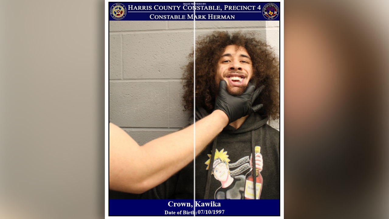 The mugshot taken by the Harris County Precinct 4 Constable’s Office shows a deputy with his hand on 22-year-old Kawika Crown’s face after his arrest on a misdemeanor charge of unlawful carrying of a weapon.