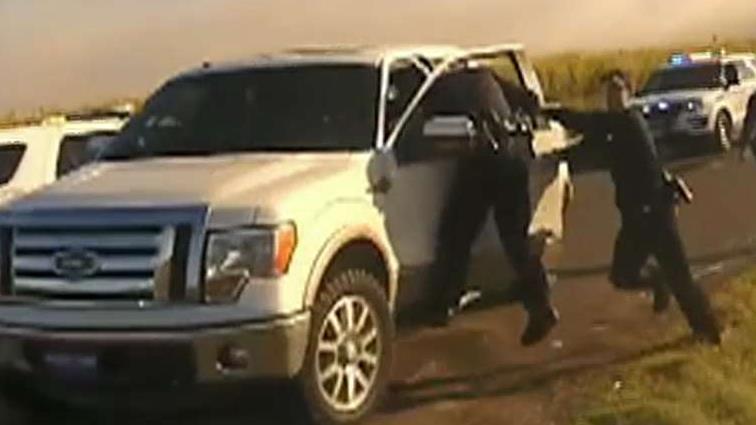 A Texas police officer is seen clinging to the door of a truck as the suspect hits the gas and speeds off during a traffic stop.