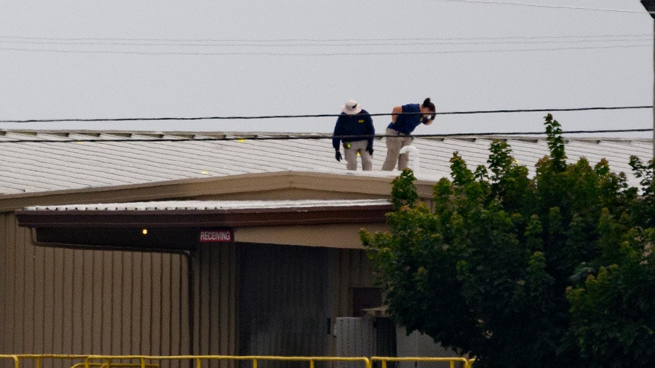 Two FBI investigators scan the roof of AGR International Inc, the building adjacent to the Butler Fairgrounds, from which alleged shooter Matthew Thomas Crooks fired at former President Trump, on July 14, 2024 in Butler, Pennsylvania. (Jeff Swensen/Getty Images)